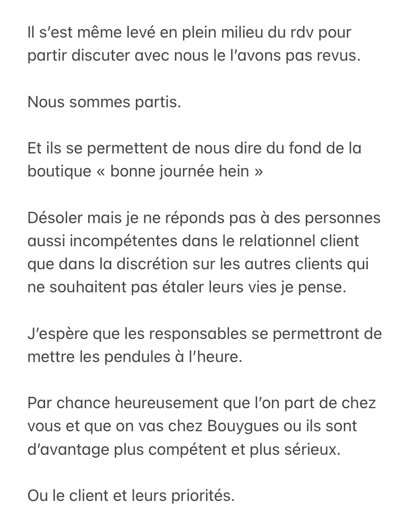 Bonjour, j'ai ramené mon téléphone en location le 11 Novembre, ainsi que mon décodeur car je viens de passer a la fibre. Vous aviez un problème informatique , pas possible de me donner le bon de retour de téléphone, soit ... nous nous mettons d'accord sur le fait que vous gardiez le téléphone, et que je vous signe en retour de mail le bon de restitution, mais pas de nouvelles depuis ce jour et je n'arrive pas à vous joindre par téléphone, malgré mes appels répétés , j'appelle le 1023 personne ne peut m'aider , je dois retourner vous voir, alors que j'habite a 40km . Je vois que vous répondez aux avis google, donc vous êtes sensibles à l'avis de vos clients et à leur satisfaction, donc pouvez vous m'aider ? Merci par avance, Cordialement Édit le jour même, appel du responsable de la boutique a l'instant très sympa , problème de mail on pense , faut dire j'ai pas une adresse mail facile , et envoi direct du document dans la foulée , mon avis reprend donc 5 étoiles en toute logique car l'expérience client malgré ce contretemps et malentendu était excellente! Merci aussi à Myriam . Je reste cependant convaincu qu'une boutique devrait être joignable par téléphone 🙂